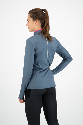 Deze mooie dames longsleeve heeft een roze accentuerende korte rits en het opstaande kraagje is voorzien van kin bescherming zodat deze rits niet gaat irriteren tijdens het hardlopen.